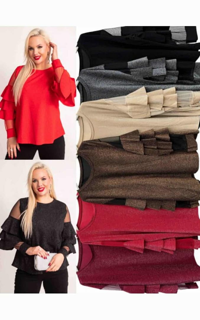 Rękawy zdobione są delikatnymi falbankami z siateczką, które dodają całości lekkości, kobiecości i subtelnego uroku. Błyszczący materiał pięknie odbija światło, dzięki czemu bluzka sprawdzi się doskonale podczas świąt, uroczystości czy wieczornych wyjść.