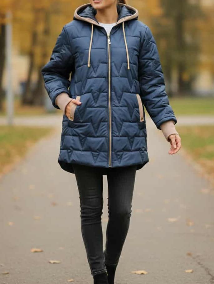 Stylowa granatowa kurtka pikowana, lekko ocieplana, świetnie sprawdzi się w przejściowe dni jesienią i wczesną wiosną. Klasyczny, elegancki kolor został przełamany subtelnymi beżowymi dodatkami, które nadają całości wyjątkowego charakteru. Krój kurtki został zaprojektowany z myślą o komforcie i nowoczesnym stylu – przód jest nieco krótszy, natomiast tył wydłużony, co nie tylko dobrze wygląda, ale też zapewnia dodatkową ochronę przed chłodem. Przedłużone rękawy ze ściągaczem dbają o dodatkową wygodę i osłonę przed chłodem. .Idealna do codziennych stylizacji – zarówno casualowych, jak i bardziej eleganckich.