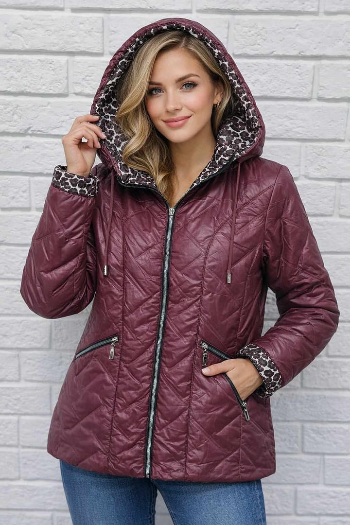 Stylowa bordowa kurtka damska, lekko ocieplana, z odpinanym kapturem. Idealna na chłodniejsze dni – wygodna, funkcjonalna i kobieca.